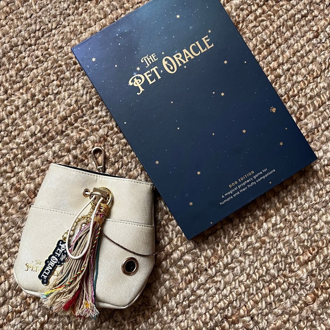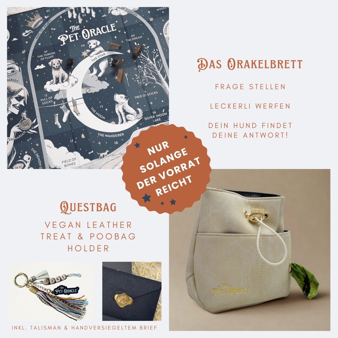 Deine magischen Essentials im Set. Das Pet Oracle Prophezeiungs-Brettspiel und unsere stilvolle Leckerli-Tasche.